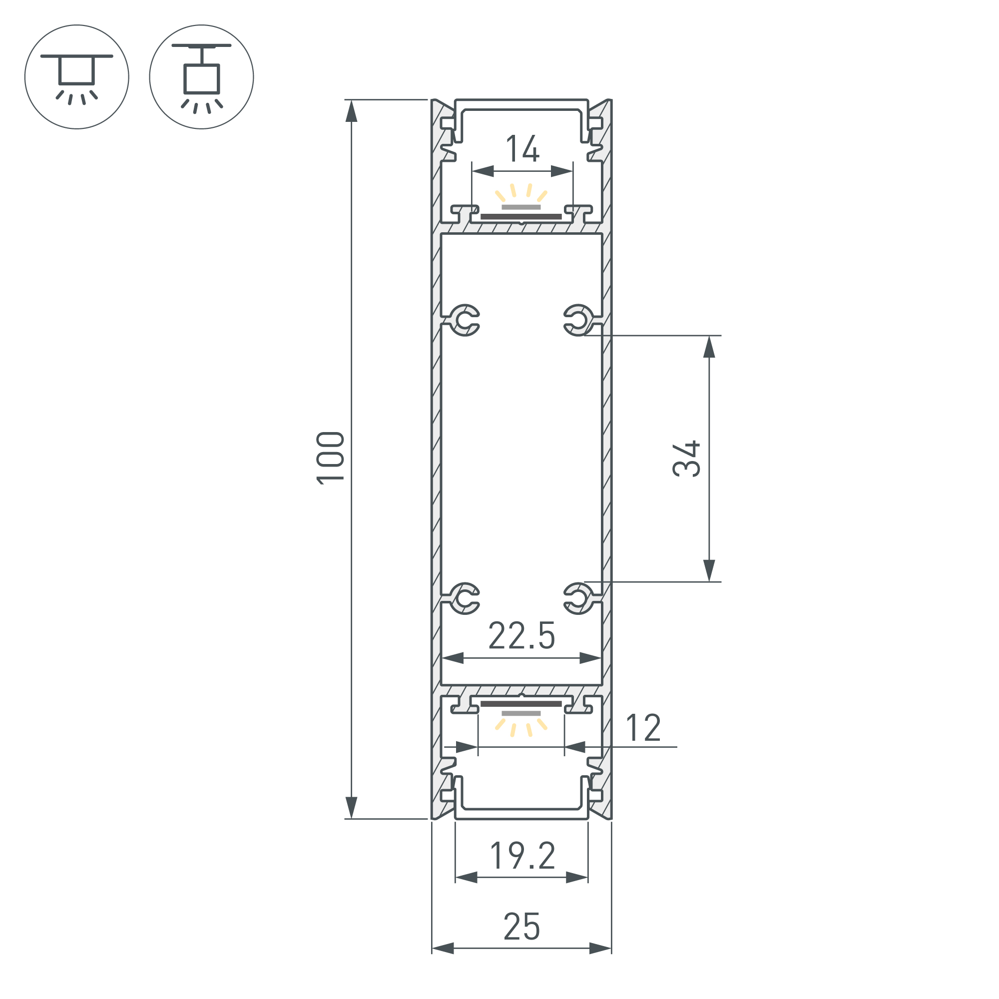Подвесной/накладной профиль черного цвета из алюминия с двусторонним свечением вверх-вниз для основного и акцентного освещения. Габаритные размеры профиля составляют 2500 мм в длину, 25 мм в ширину и 100 мм в высоту. Площадки для установки светодиодных лент позволяют использовать ленты шириной до 12 мм и мощностью до 33 Вт/м каждая. Это обеспечивает гибкость в выборе светодиодных лент и создает потрясающие световые решения. Экраны, заглушки и другие аксессуары не включены в комплект и приобретаются отдельно. Цена указана за 1 метр профиля. Отличное решение для создания современных световых проектов.