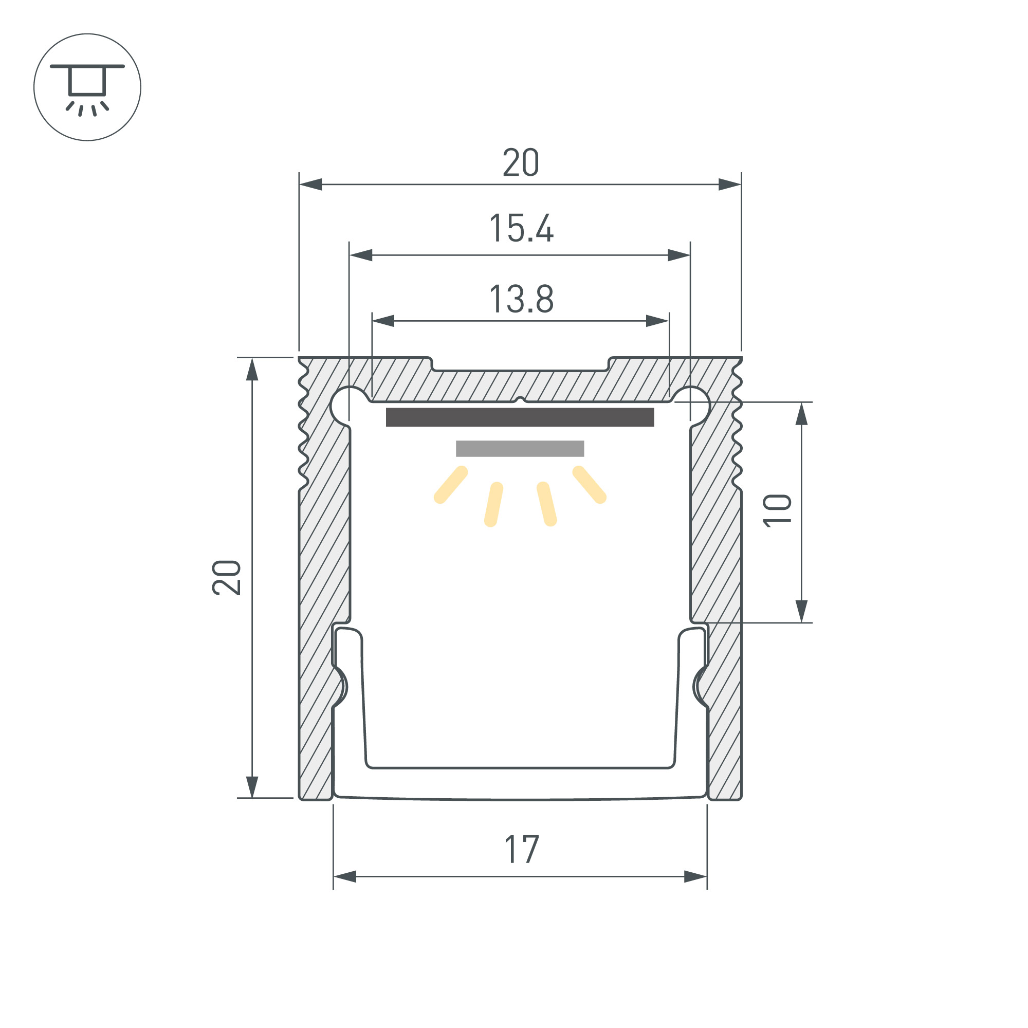 Алюминиевый анодированный профиль для светодиодных лент и линеек. Габаритные размеры (L×W×H): 3000x20x20 мм. Ширина площадки для ленты 15 мм. Экраны, заглушки и другие аксессуары приобретаются отдельно. Цена за 1 метр.