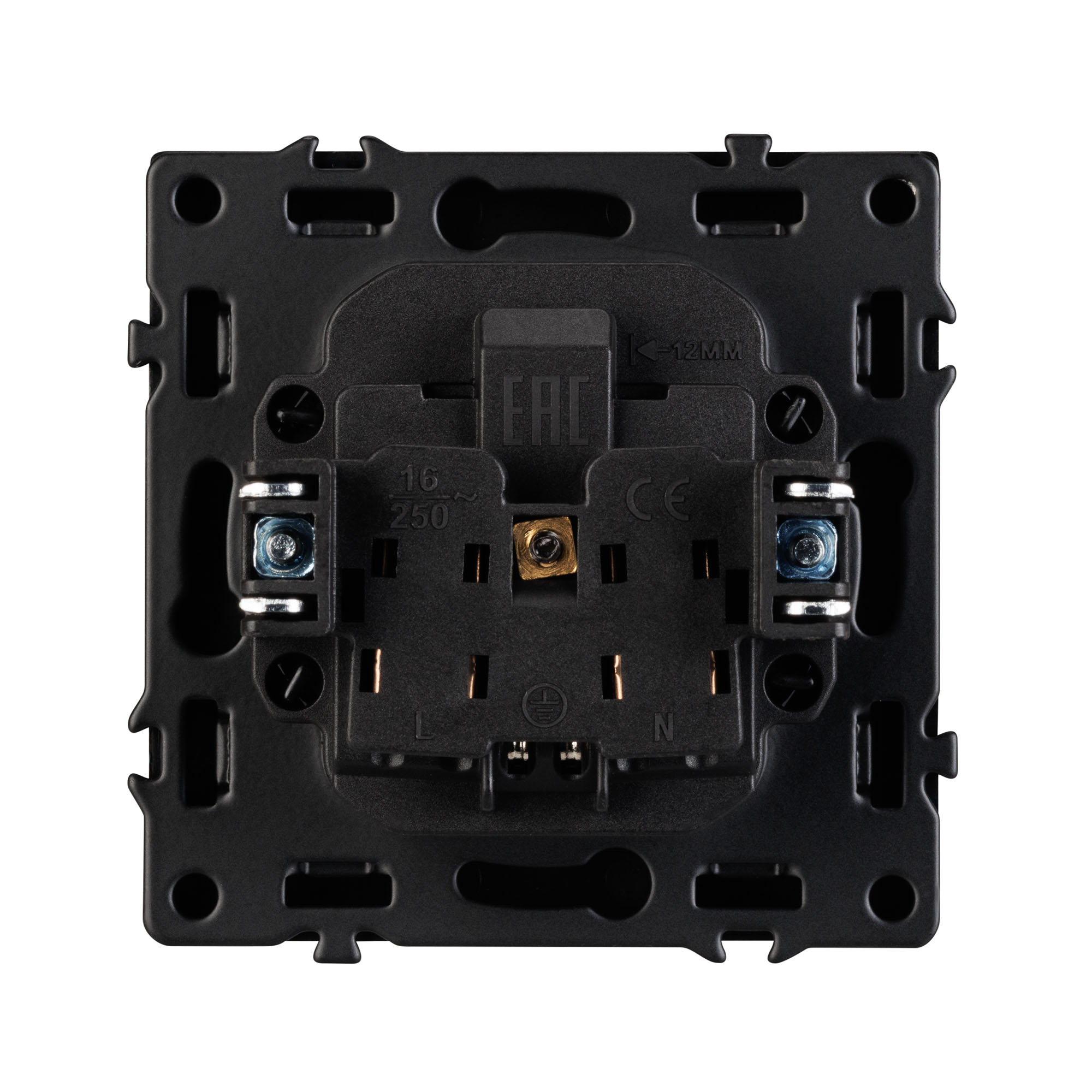 Механизм розетки с заземлением на 1 пост. Цвет - черный, с Soft-Touch покрытием. Без фронтальной рамки. Уровень пылевлагозащиты IP20. Розетка устанавливается в стандартный подрозетник круглого сечения диаметром 60мм. Габаритные размеры: длина 71 мм, ширина 71 мм, высота 44 мм. Гарантийный срок 10 лет.