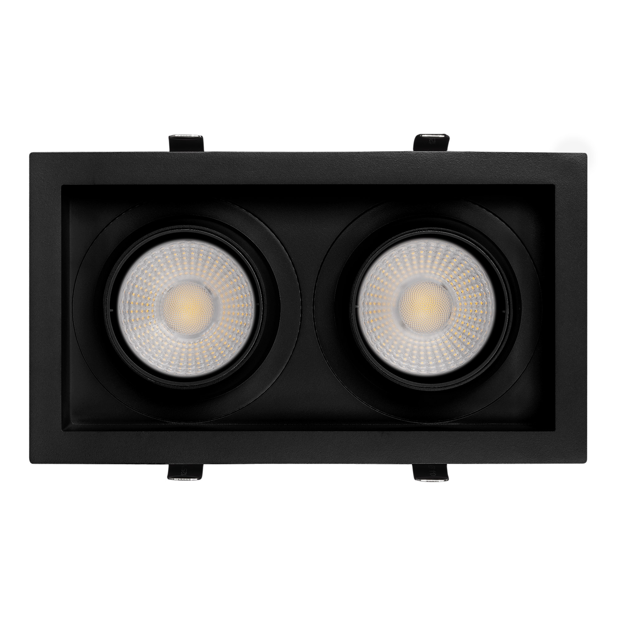 Поставка под заказ от 24 шт. Встраиваемый карданный светильник. Мощность 2х30 Вт, св. поток 5300 лм, 88 лм/Вт, дневной 4000 K, CRI>92, угол 50°, напряжение питания 230 В. Чёрный корпус из алюминия, черная вставка, степень защиты IP20. Размер: длина 250 мм, ширина 140 мм, высота 125 мм. Монтаж встраиваемый, установочное отверстие: длина 230 мм, ширина 120 мм. Драйвер 24-42 В, 750 мА, пульсация <2%.