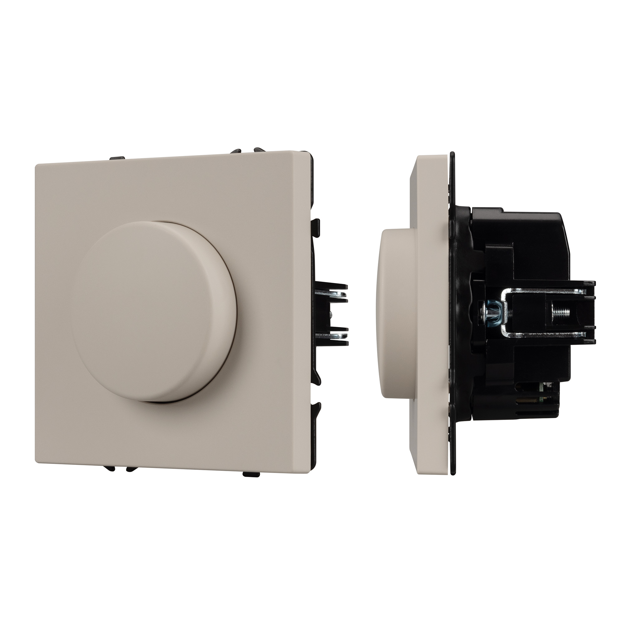 Строгие геометрические линии гармонично сочетаются с функциональностью продуманных механизмов, создавая идеальное решение для дизайн-проектов, где важны эстетика и практичность. Светорегулятор совместим с рамками серии NOBE, создавая утонченный минималистичный вид. Скрытый тип монтажа позволяет гармонично встроить в интерьер любого современного дизайн-проекта. Видимая часть механизма выполнена из высококачественного пластика цвета кашемир и имеет Soft-Touch покрытие, что придает изделию приятные тактильные ощущения и стильный внешний вид. Настройка интенсивности освещения осуществляется за счет поворотной ручки (ротора). Она позволяет включать, выключать и регулировать свет и его яркость. Светорегулятор предназначен для управления светодиодными (до 150Вт) или другими источниками света (до 300Вт) с напряжением питания 230В. Суппорт окрашен в черный матовый цвет под основу механизма и выполнен из металла толщиной 1,5мм, что обеспечивает безопасность и уверенность в установке. На каждой стороне суппорта размещены фиксирующие элементы, позволяющие комбинировать механизмы в системы до 5шт как горизонтально, так и вертикально.