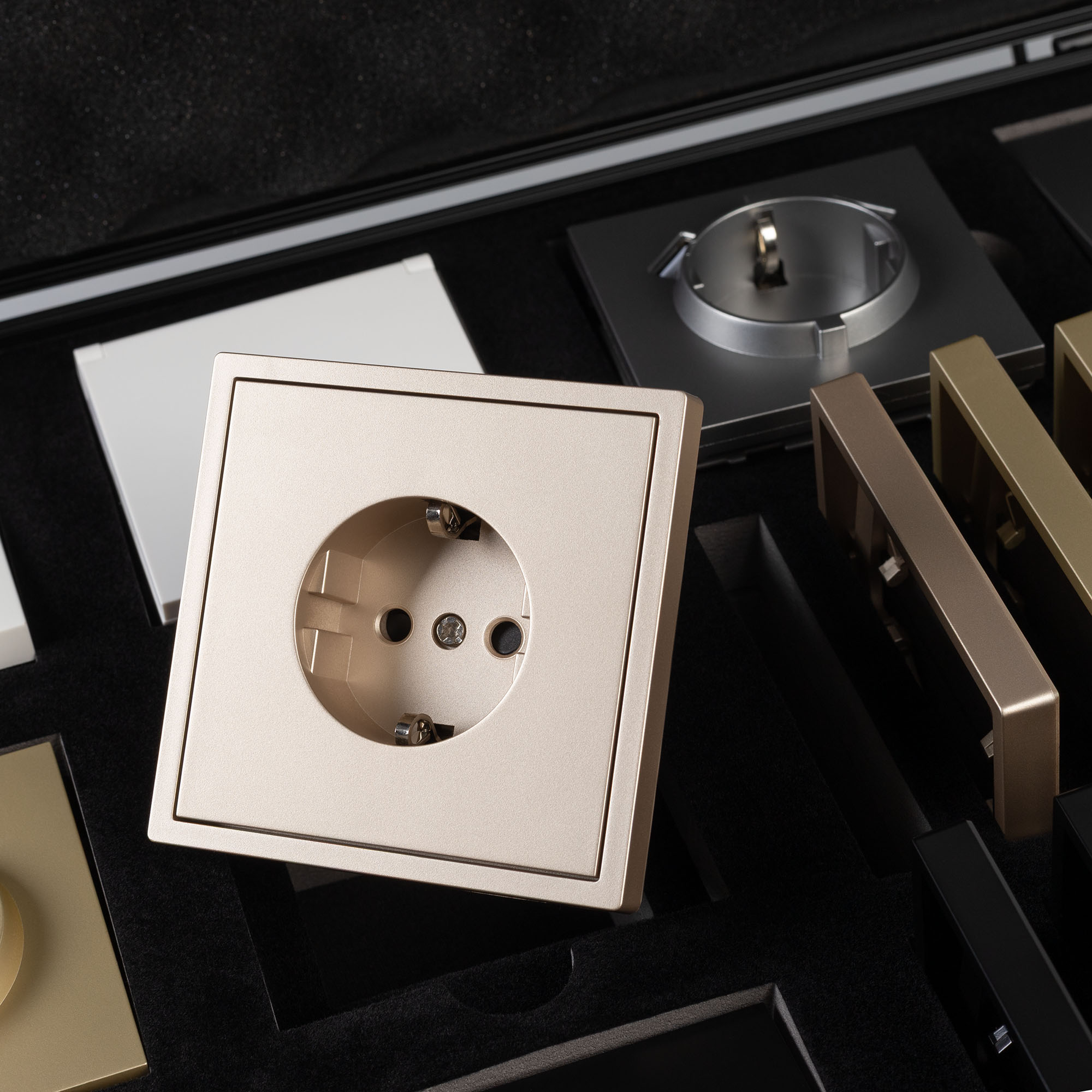Демо-кейс с наполнением электроустановочных изделий серии TENDO. Демо-кейс содержит: Рамки серии TENDO в цветах белый, черный, золотой и серебристый (серый). Поверхность рамок имеет матовое и Soft-Touch покрытие; Механизм компьютерной розетки (двойной) в черном цвете - арт.054595 Механизм розетки с дополнительными USB Type A + Type A выходами в серебристом(сером) цвете - арт.054084 Механизм выключателя на две клавиши (проходной) в белом цвете - арт.054556. Механизм розетки под евровилку в золотом цвете - арт. 054081 Механизм USB розетки в золотом цвете - арт. 054537 Механизм звонкового выключателя в серебристом(сером) цвете - арт. 054589 Механизм выключателя на одну клавишу (перекрестный) в черном цвете - арт. 054055 Механизм розетки влагозащищенный в белом цвете - арт. 054090 Рамки представленной серии накладного типа монтажа - не требуют дополнительного оборудования для установки рамки на механизме.