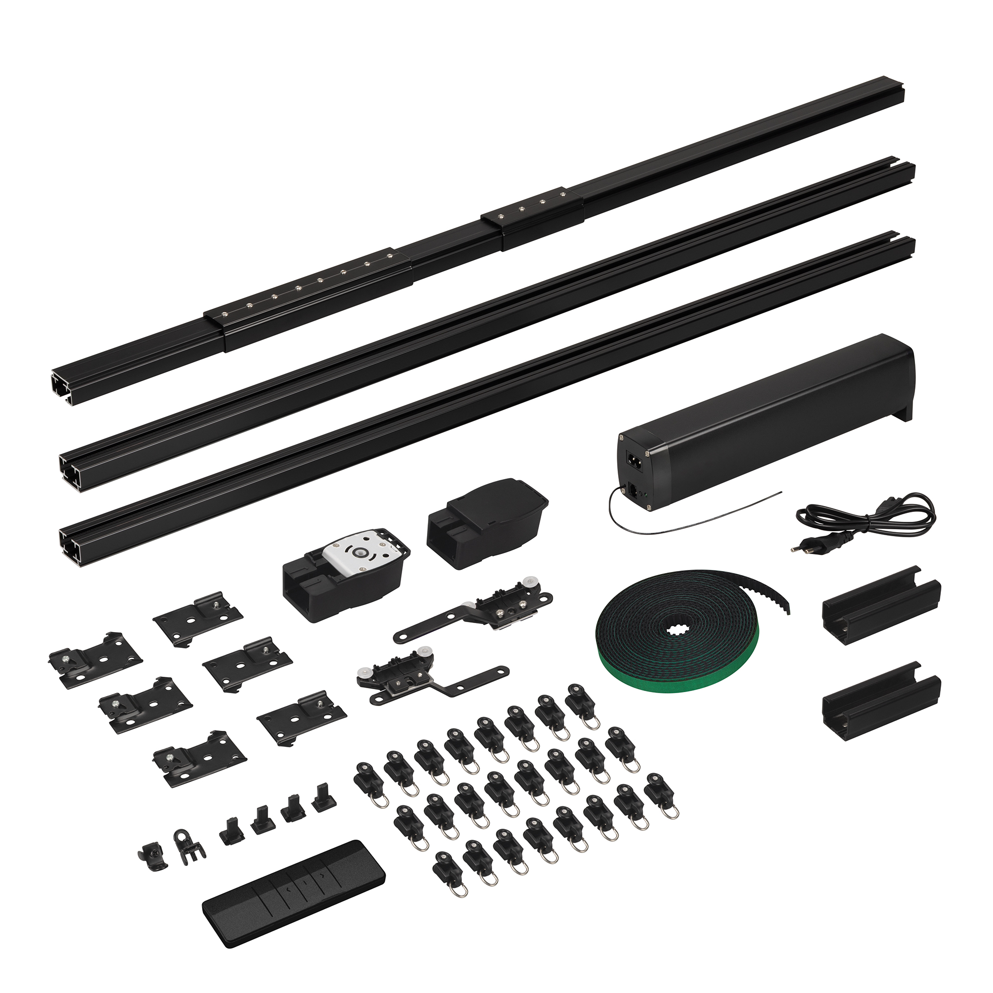 Комплект электрокарниза в черном цвете длиной до 3м (регулируется наборными частями) для раздвижных штор, состоящий из мотора, наборного алюминиевого трека, пульта и комплектующих. Электропривод с питанием 100-240В, мощность 45Вт, момент 1.2Нм, вес штор до 40кг. Управление с помощью пульта из комплекта, по WI-FI, 2.4ГГц, Bluetooth, "сухими" контактами на входе RJ45. Совместим с платформой TUYA, АЛИСА от ЯНДЕКС. Управление со смартфона через приложение SmartLife, с помощью пульта в комплекте.