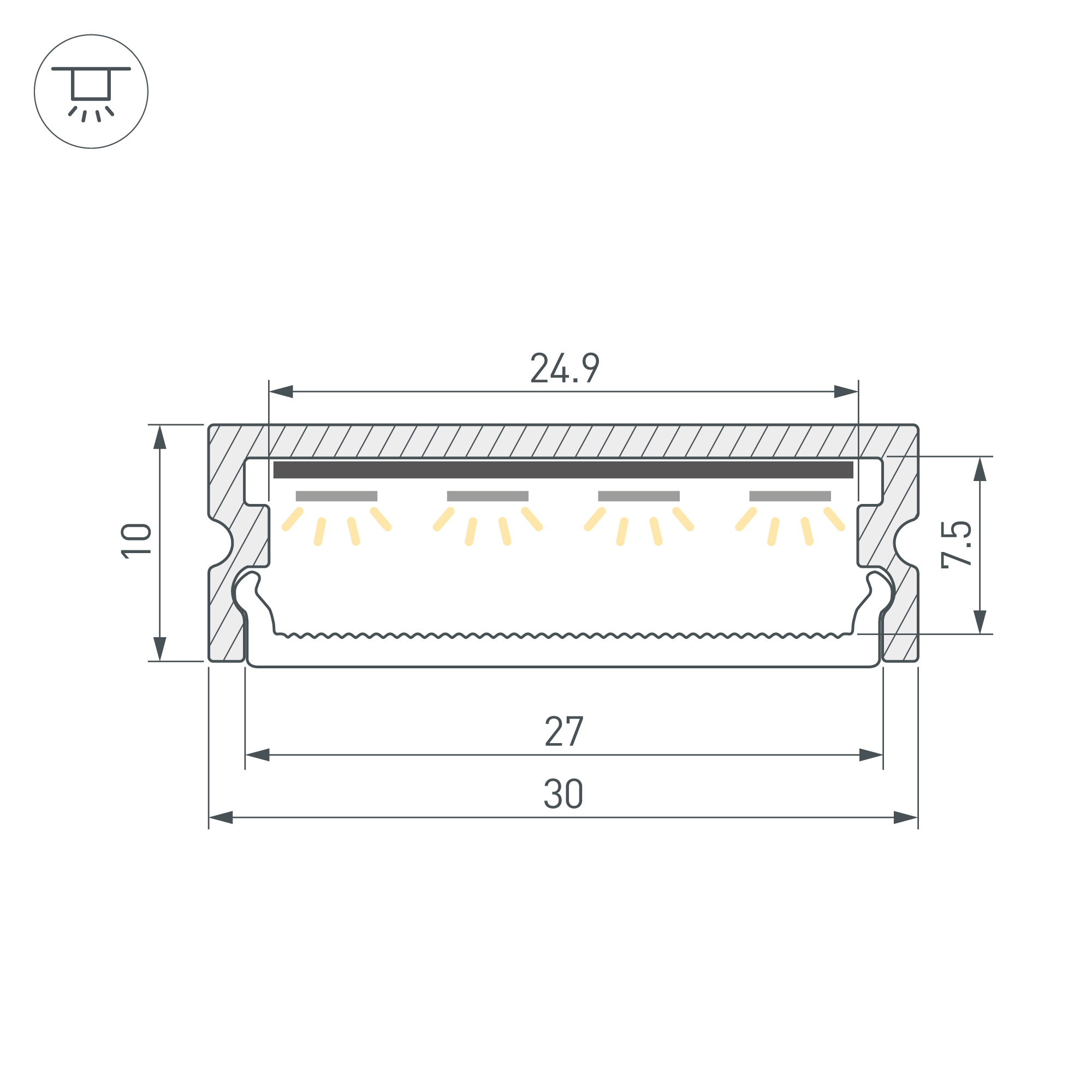 Алюминиевый анодированный накладной профиль для светодиодных лент и линеек. Габаритные размеры (L×W×H): 2000x30x10 мм. Ширина площадки для ленты 24 мм. Экраны, заглушки и другие аксессуары приобретаются отдельно. Цена за 1 метр.