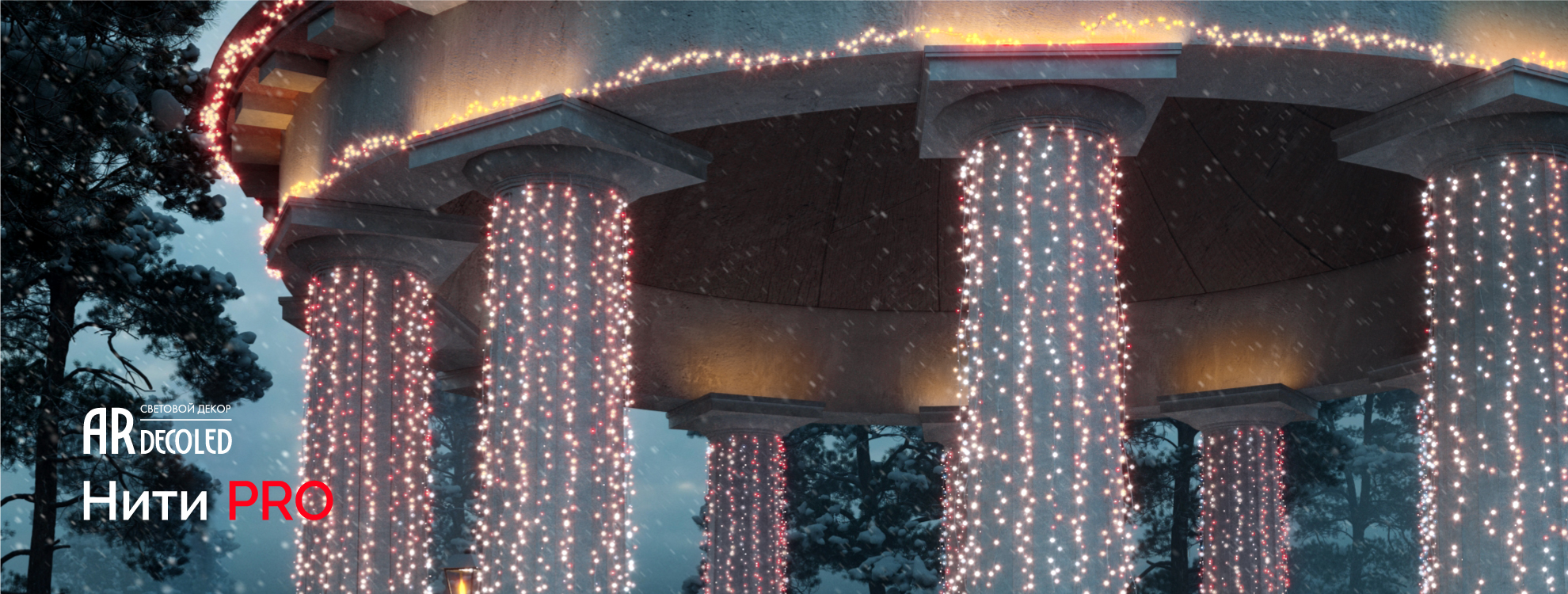 Гирлянды «Нити» серии PRO за счет прочного каучукового провода и длины 10 м подходят для крупных коммерческих проектов. Гирлянды типа «Нить» универсальны и обладают большими возможностями применения: их можно использовать для подсветки окон в кафе и магазинах, оформления торговых центров и веранд.