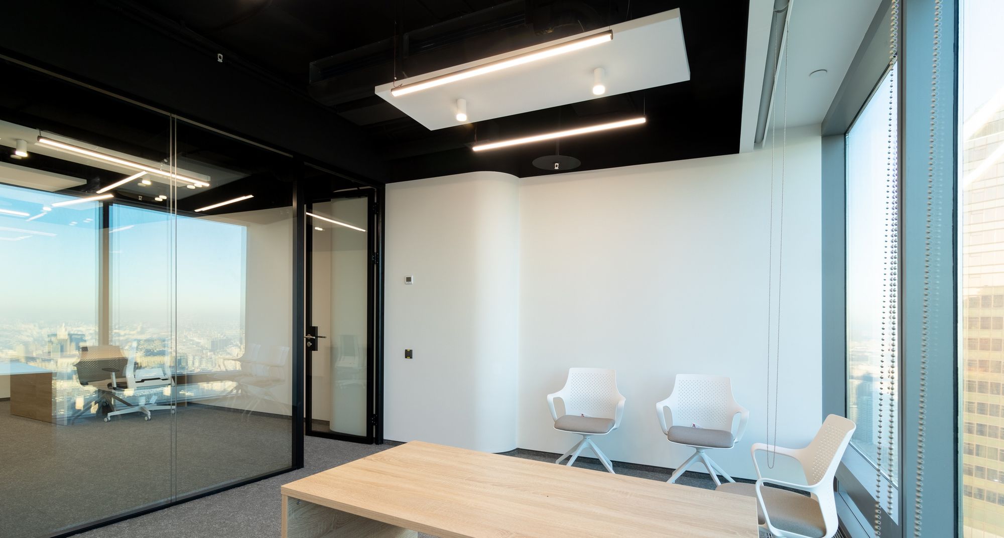 Современный офис с панорамным видом на Москву превратился в уникальное световое пространство. Основным элементом оформления стали подвесные линейные светильники на тросах, при создании которых использовали профиль круглого сечения с матовым экраном. Подвесные светильники не только создают комфортное основное освещение, но и являются дизайнерскими объектами. Для разных зон офиса выбраны разные оттенки белого: теплый белый располагает к комфортному общению, а дневной настраивает на активную работу в течение всего дня. В коридоре использовали встроенные линии света с лентами на черной плате — они очень эффектно смотрятся в помещениях с темными стенами и не выделяются на их фоне. Стильные и оригинальные светильники в виде колец собраны из профилей и широкой светодиодной ленты. В деревянные перегородки заложили линии света, подчеркнув благородную текстуру натурального дерева.