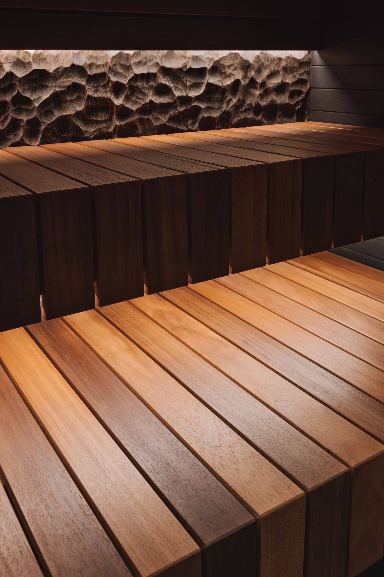 Для более расслабляющей атмосферы источники света скрыты от глаз посетителей. Светодиодные ленты установлены в накладные профили SLIM, которые обеспечивают хороший теплоотвод, что особенно важно в условиях высоких температур. Профили с лентами размещены под полка́ми, подспинниками и в пространстве между потолком и стеной. Благодаря этому в сауне создается стильный эффект «парящего» потолка, а также подчеркивается рельеф декоративной панели из обожженной древесины.
