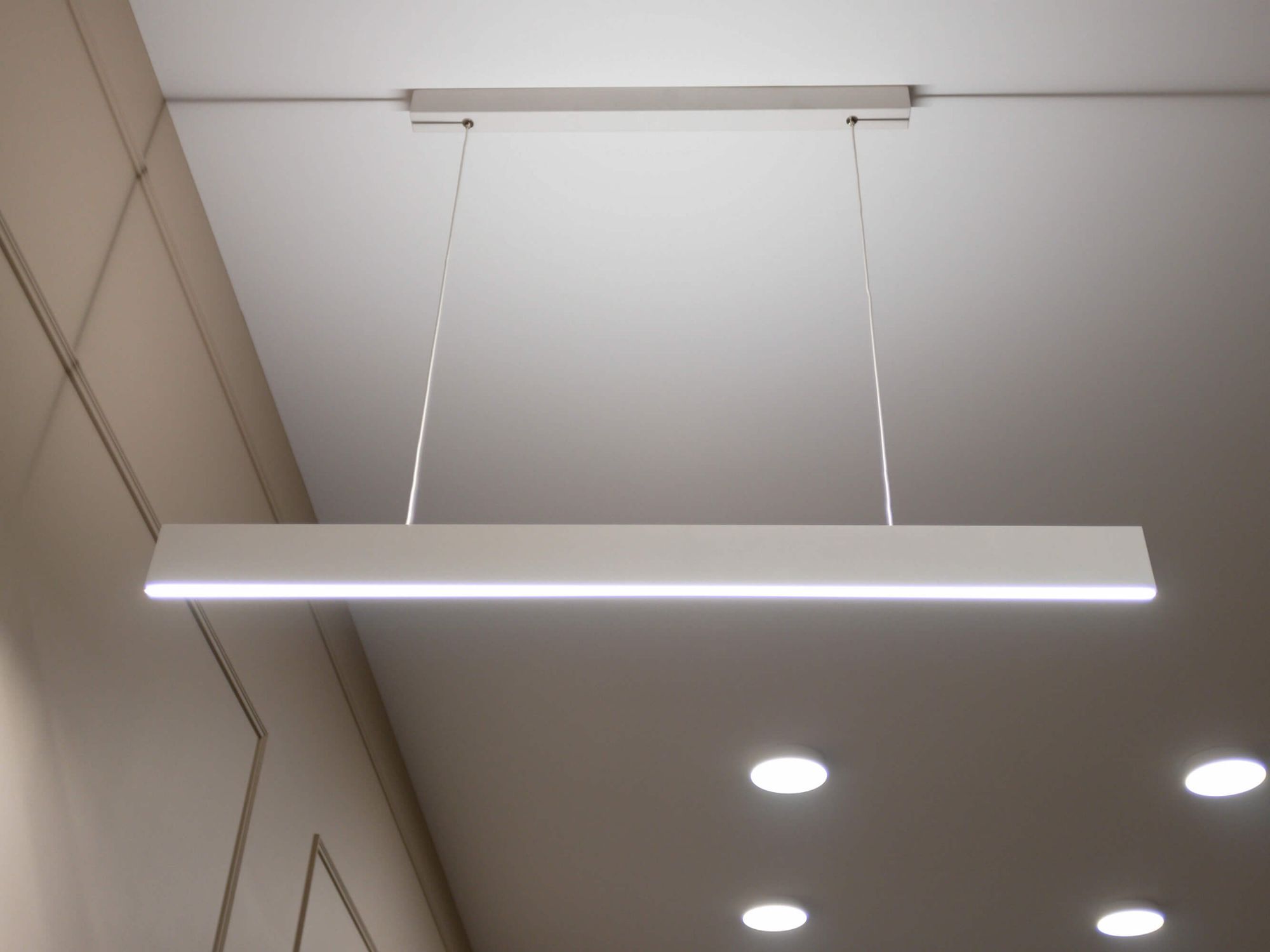 В лаконичных интерьерах лаунж-студий аккуратно и стильно смотрятся накладные круглые и подвесные линейные светильники. Они не только обеспечивают хороший уровень освещенности, но и выглядят как оригинальный элемент интерьера. Для подсветки потолка использована светодиодная лента, которая проходит по его границе плавными изгибами и добавляет пространству интересных световых деталей.